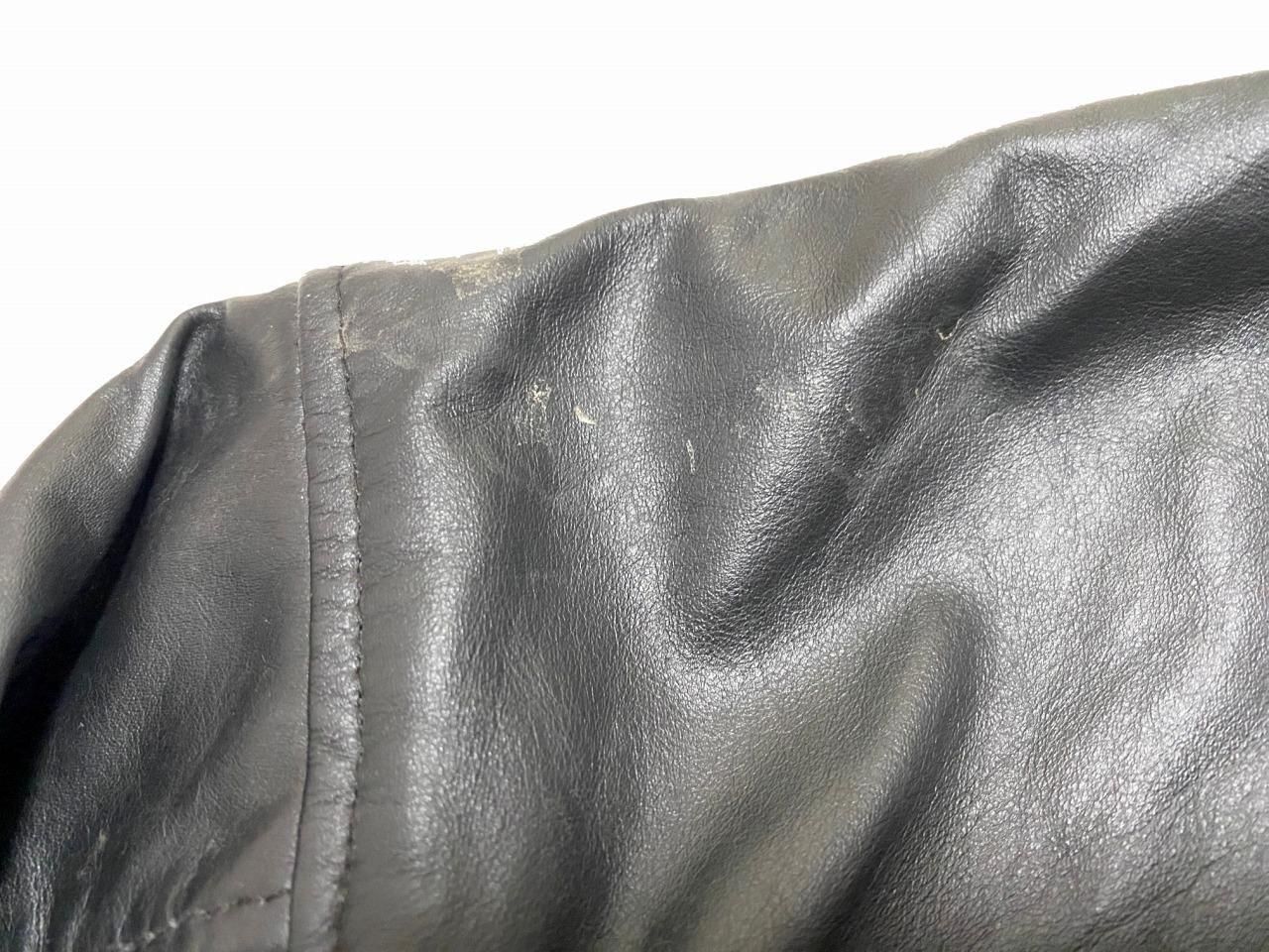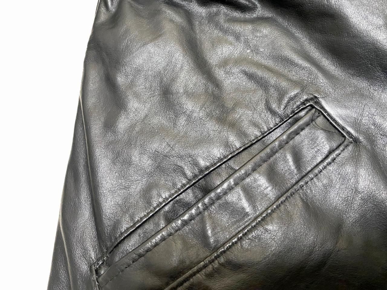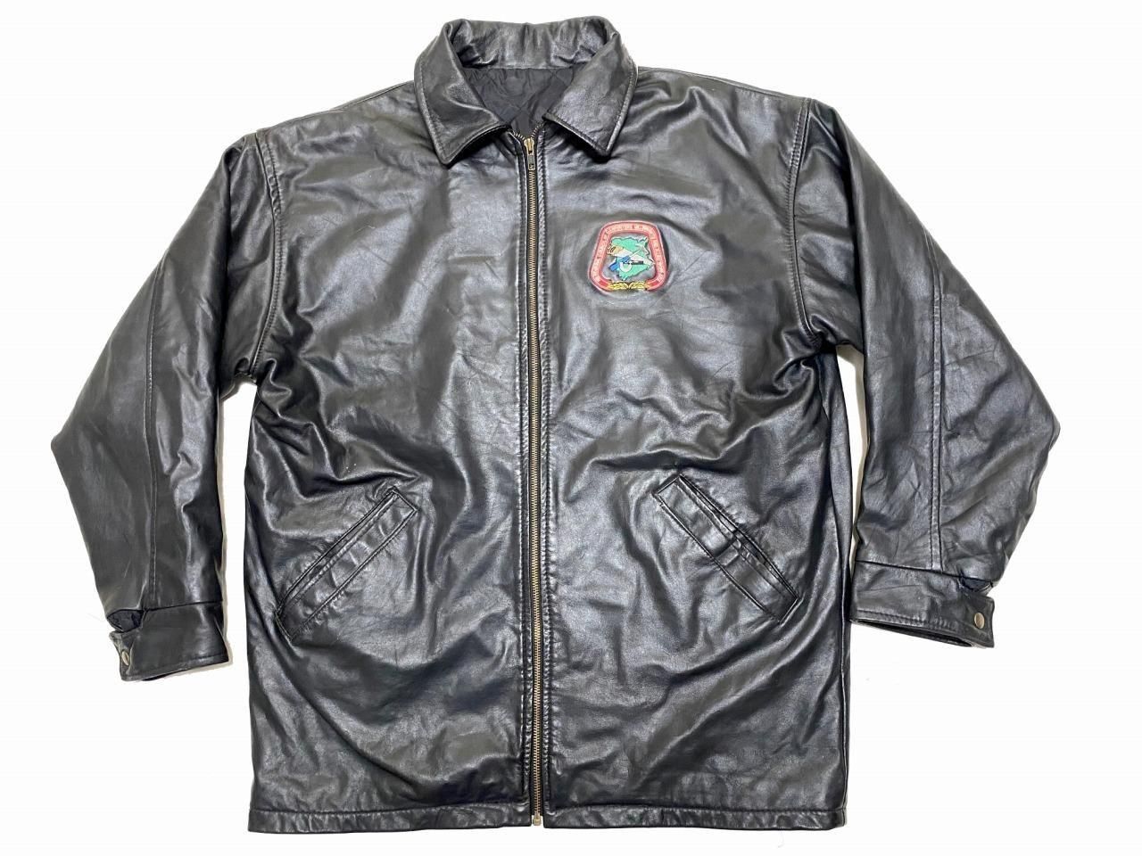 左胸にワッペン付きの黒のフェイクレザージャケットです。