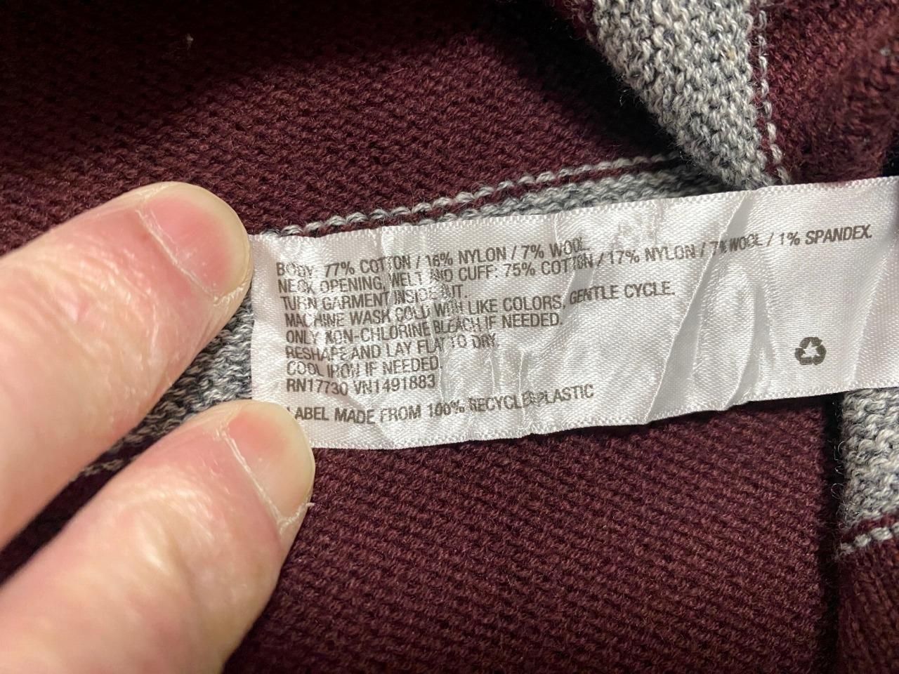 中国製で、素材はコットン77%ナイロン16%ウール7%スパンデックス1%です。