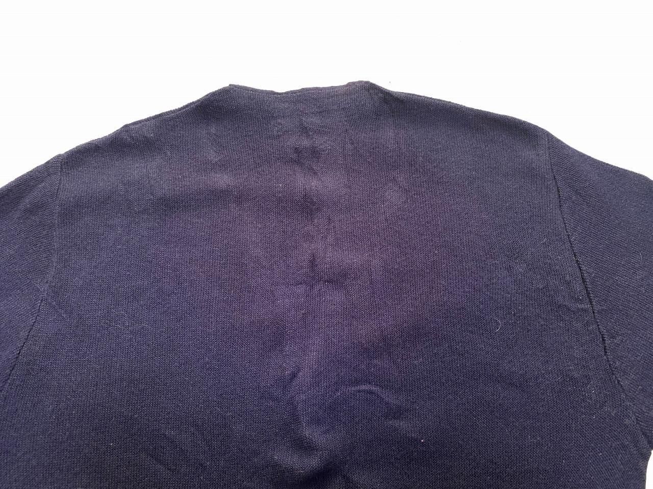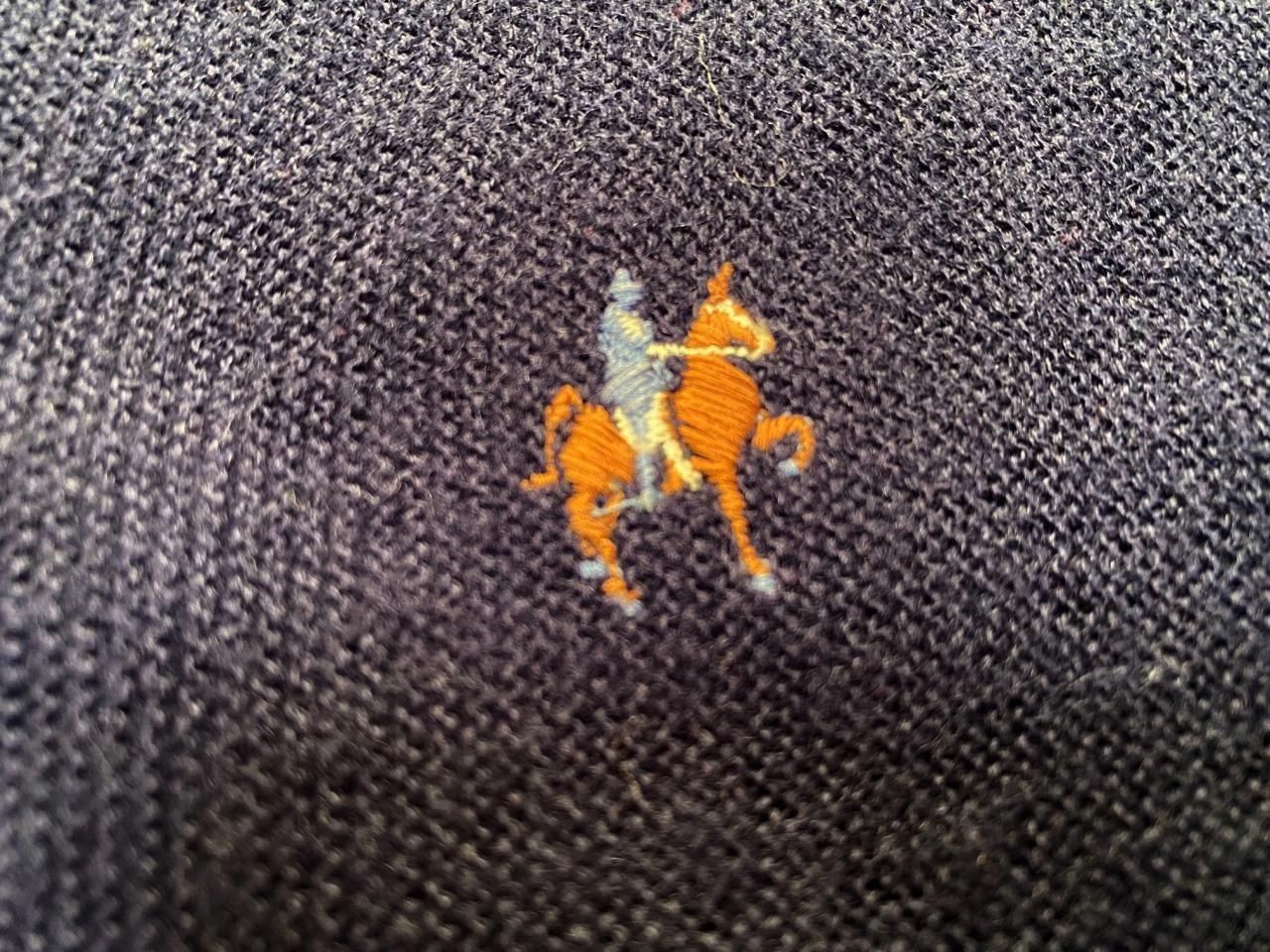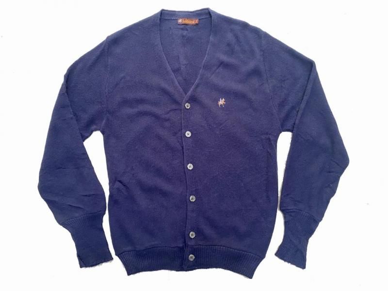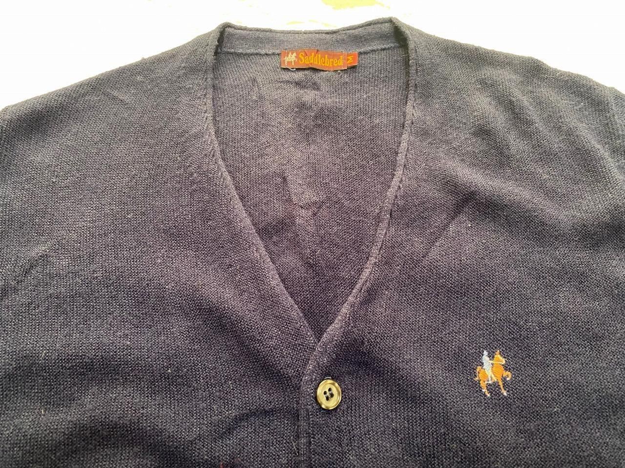 Saddlebredの紺色のワンポイントロゴ刺繍ニットカーディガンです。