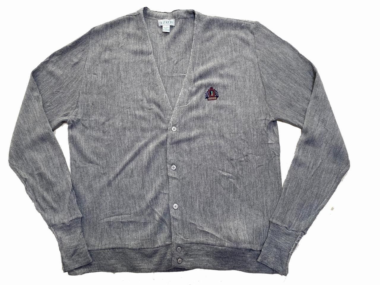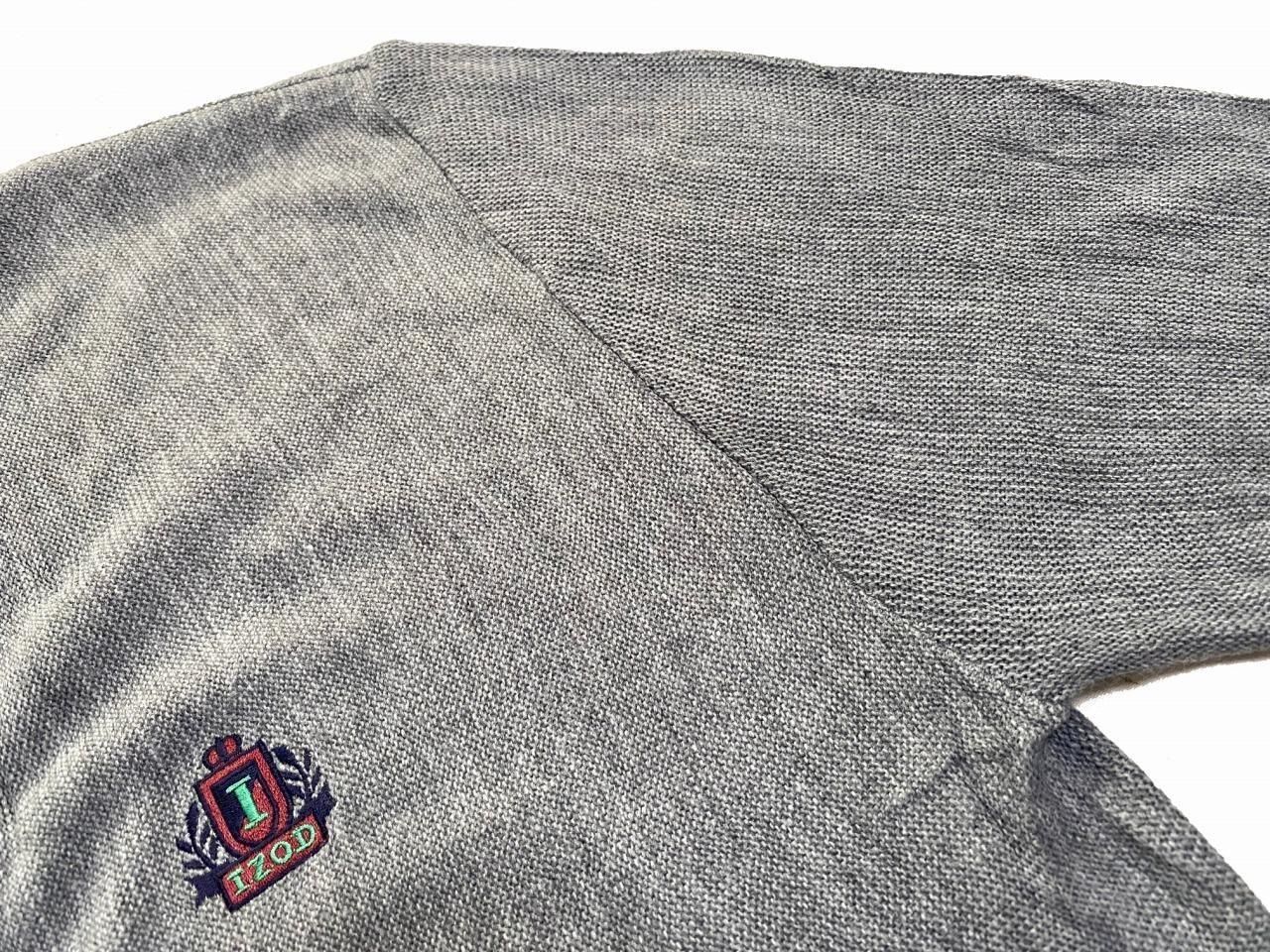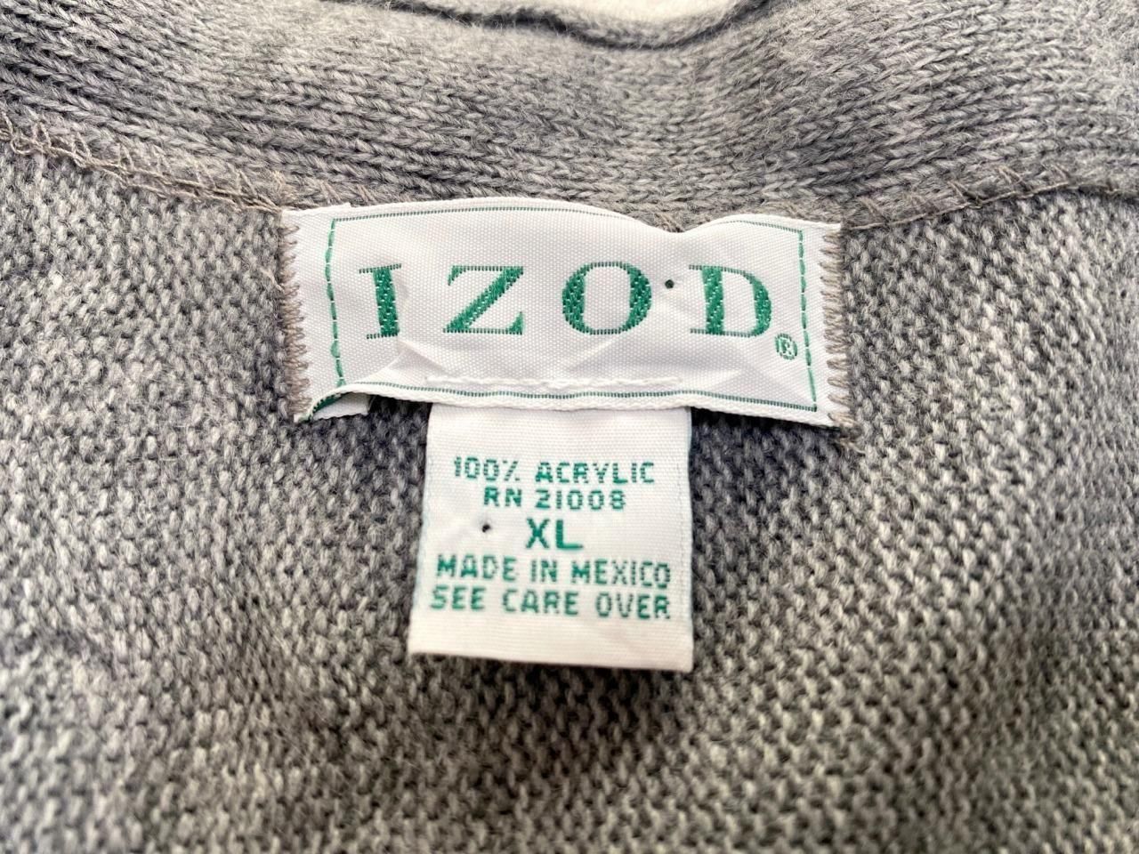 IZODのグレーのワンポイントロゴ刺繍ニットカーディガンです。