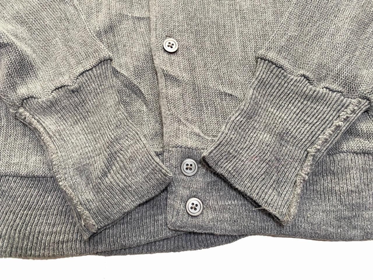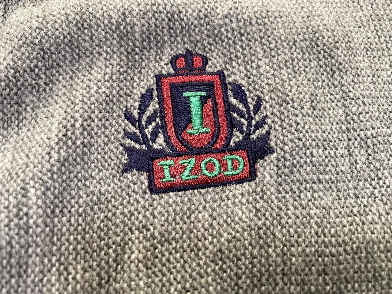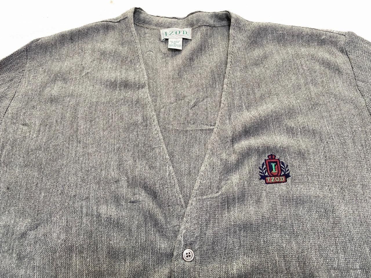 IZODのグレーのワンポイントロゴ刺繍ニットカーディガンです。